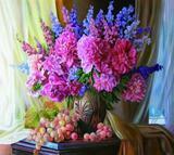 Алмазная вышивка «Букет пионов с гиацинтами и виноград» 30x40 см