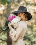 Картина по номерам «Девушка в черной шляпе с букетом пионов» 40x50 см