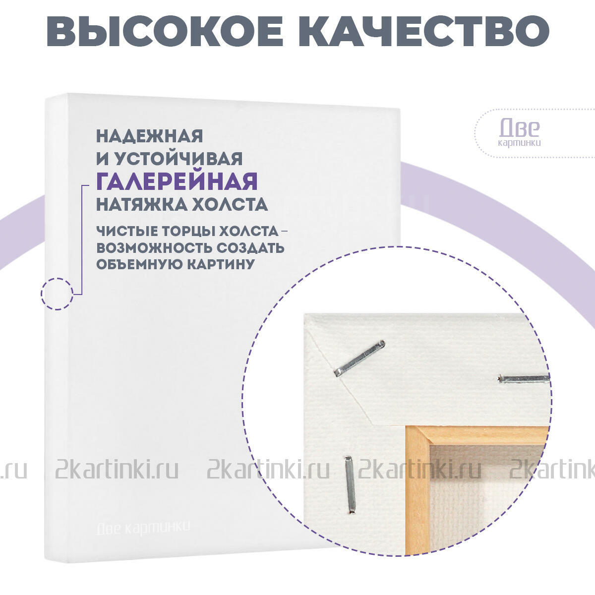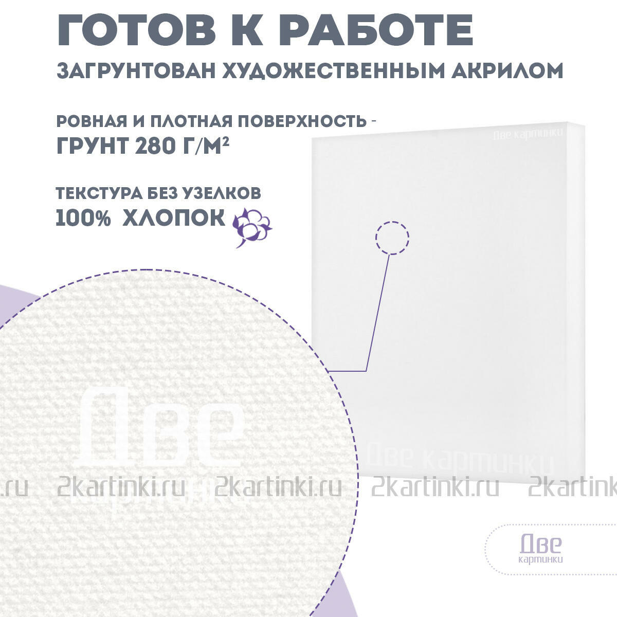 Холст натянут методом боковой натяжки на деревянный подрамник в жестком сборе. Материал холста 100% хлопок. Грунтовка акриловая 280 грамм на метр квадратный. Подрамник из дерева сосны высшего сорта. Холст на подрамнике подходит для акриловой живописи.