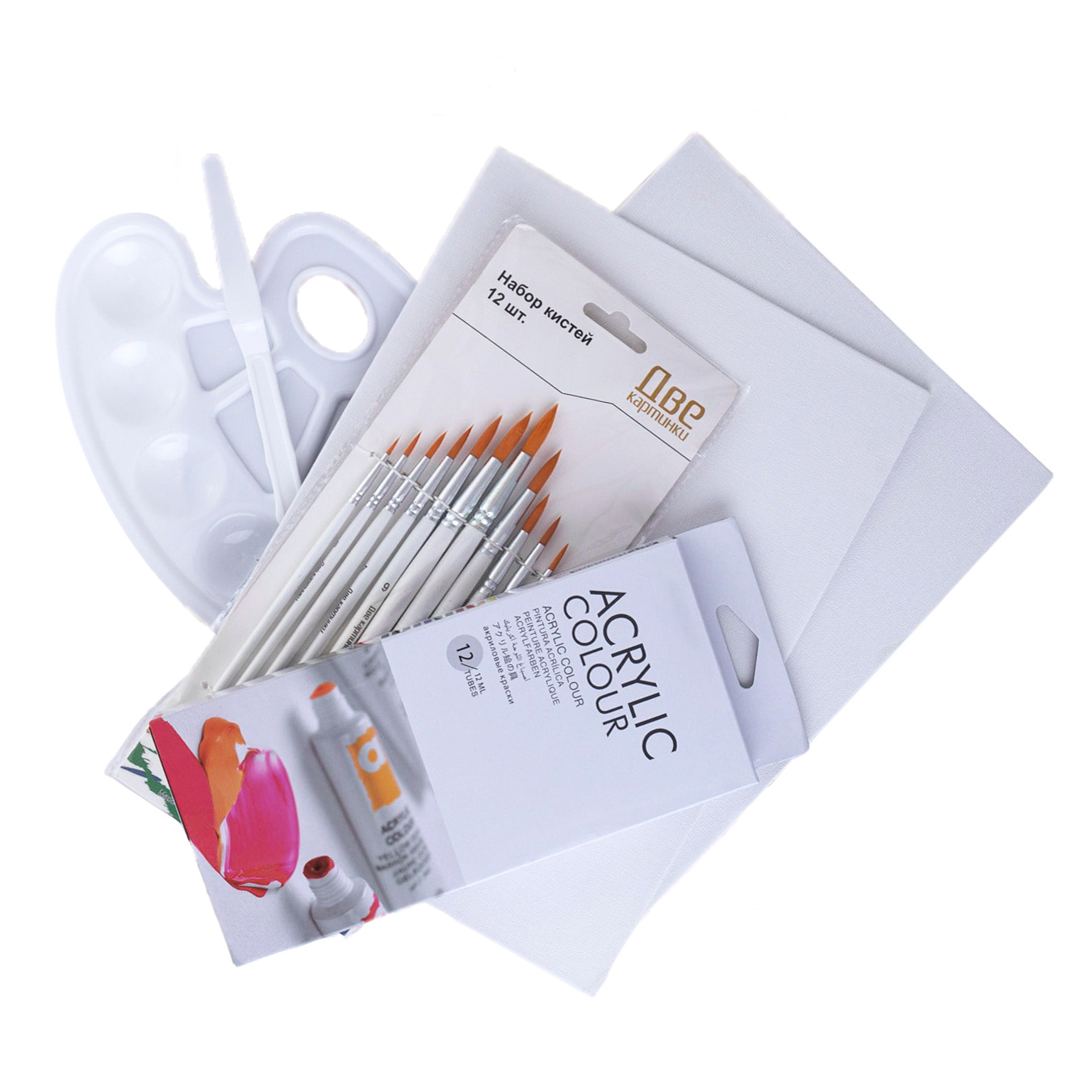 Холсты 2 шт., акриловые краски 12 шт., кисти 10 шт., палитра, мастихин 1 шт.